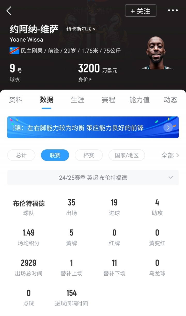 上赛季在布伦特福德,维萨出战35场比赛,打进19球4助,今夏为加盟纽卡,维萨一度罢训,最终纽卡消耗5500万镑的高价才见效签下球员。
