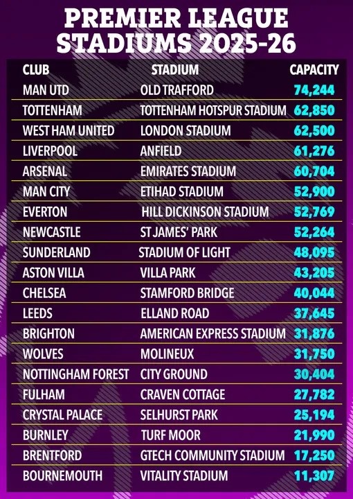 除了今夏搬进新球场的埃弗顿以外(主场容量从39414东谈主增至52769东谈主),英超还有5家俱乐部的球场容量在新赛季发生了变化。