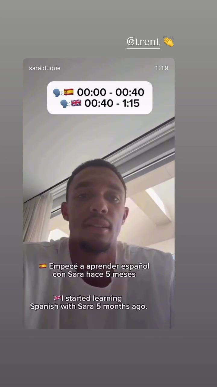 视频中,阿诺德用西语说:“你好,我是特伦特,5个月前我启动和Sara学习西班牙语。曩昔我从没说过西班牙语,我念念更好地和队友、评释、球迷相易,更好地稳当俱乐部和西班牙生计,是以才学习西班牙语。我尽头可爱这些课程,因为这专注于足球术语、发布会、采访以及与队友的相易,我尽头可爱这些课程。”
