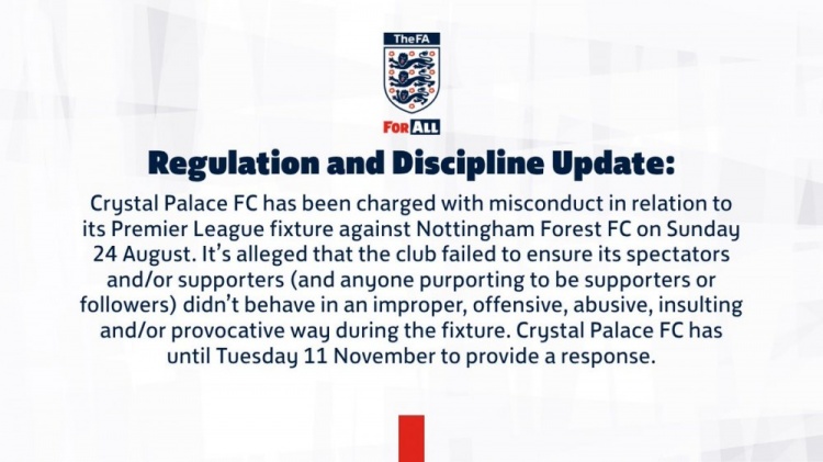 11月5日讯 英足总发布官方公告,证实水晶宫俱乐部因球迷活动欠妥遭到指控,需要在11月11日之前作念出恢复。