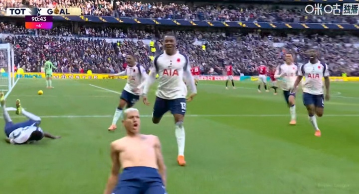 11月08日讯 本日英超曼联客战热刺,比赛第91分钟里沙利松破门反超曼联!进球后里沙利松脱衣豪情庆祝,随后捂脸情难自已。