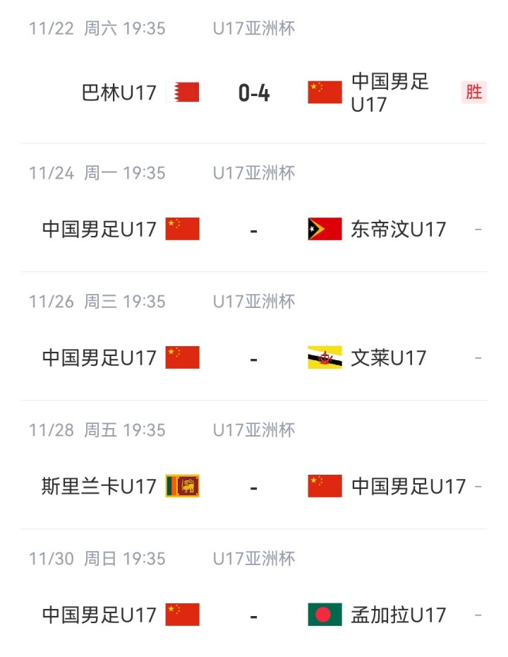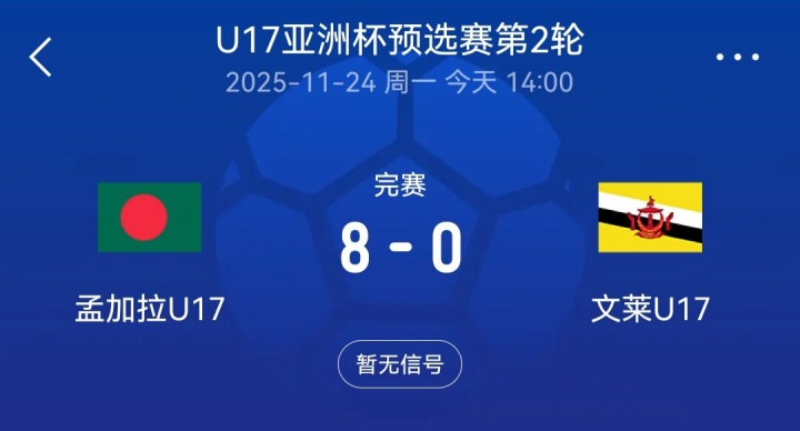 11月24日讯 在刚死心的一场U17亚洲杯预选赛中,孟加拉U17 8-0大捷文莱U17,这两支球队是国少的同组敌手,现在孟加拉U17两战全胜进13球丢0球。