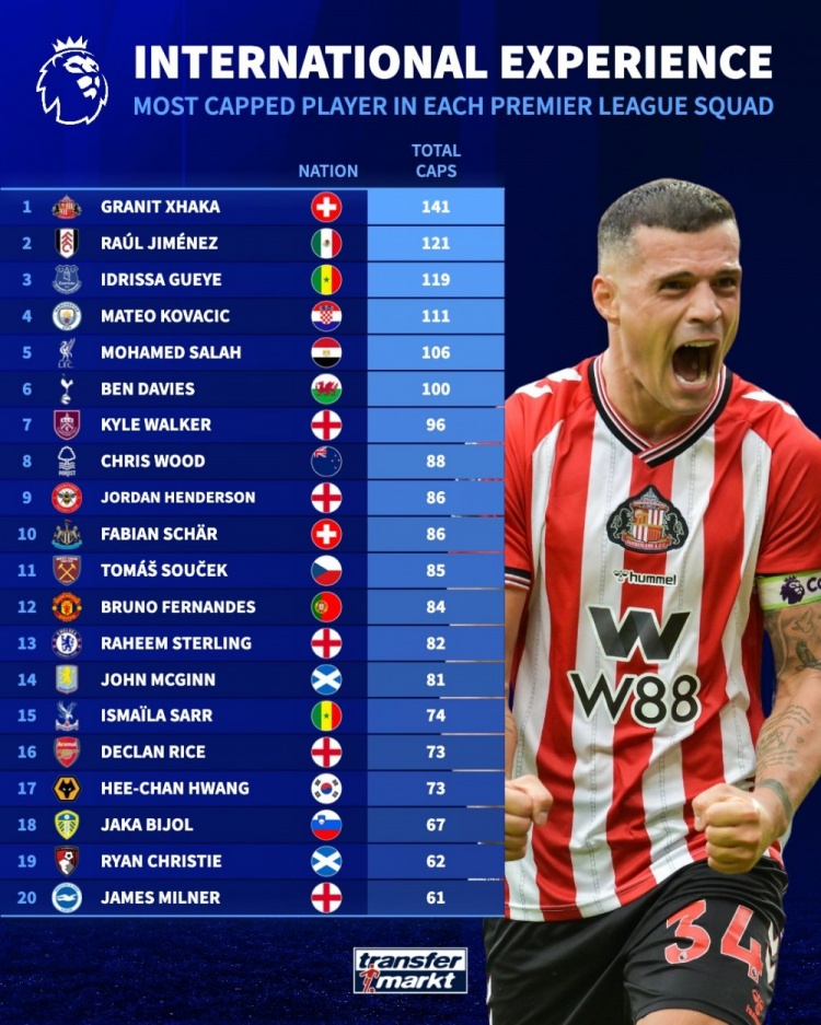 11月1日讯 英超20支球队有着诸多国脚球员,德国转会商场清点了各队为国度队出战场次最多球员,扎卡以141场居首,希门尼斯以121场位居次席。