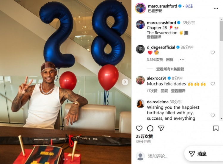 28岁生快!拉什福德社媒晒寿辰庆祝照,配文:东谈主生第28章!腾达!