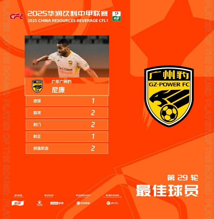 一射两传!官方:广东广州豹中场尼康当选中甲第29轮最好球员