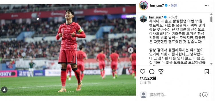 11月20日讯 孙兴慜更新酬酢媒体,感谢了在本次国度队集训技术来现场加油的韩国球迷。