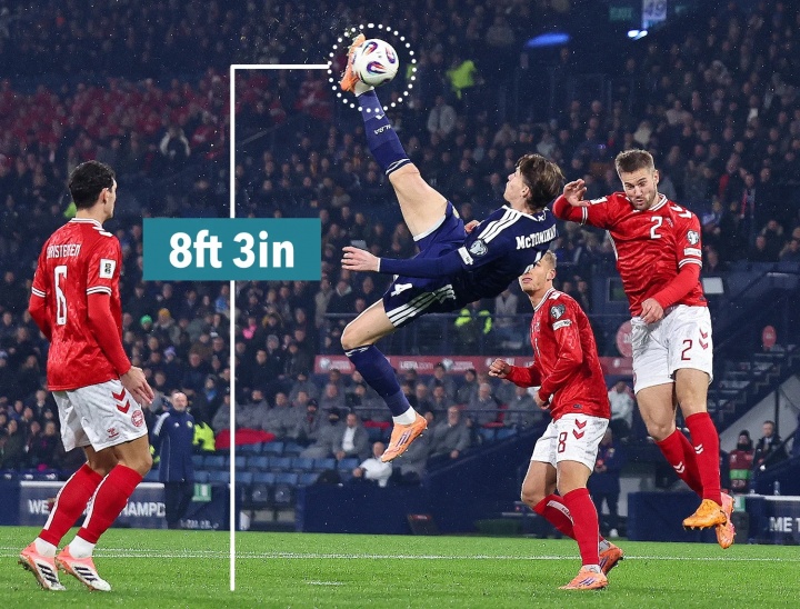 11月19日讯 欧洲区世初赛小组赛末轮,苏格兰4-2礼服丹麦,晋级2026天下杯,麦克托米奈在比赛中打入一粒精彩倒钩。