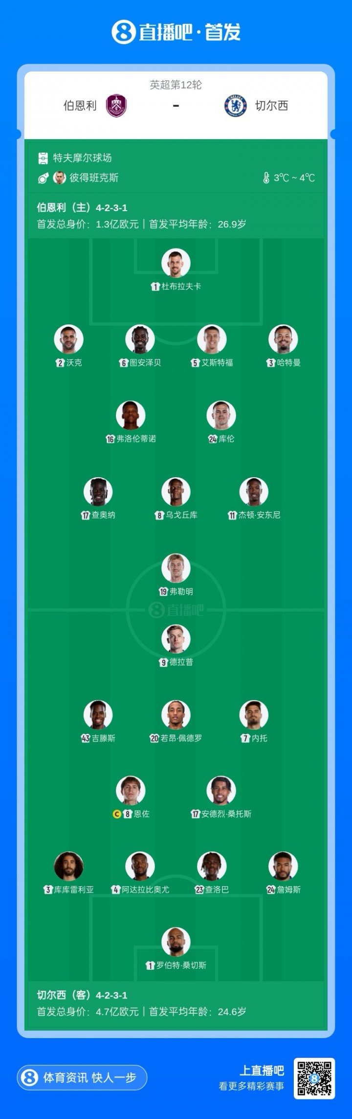 切尔西客战伯恩利首发:德拉普、恩佐、吉滕斯先发,凯塞多替补