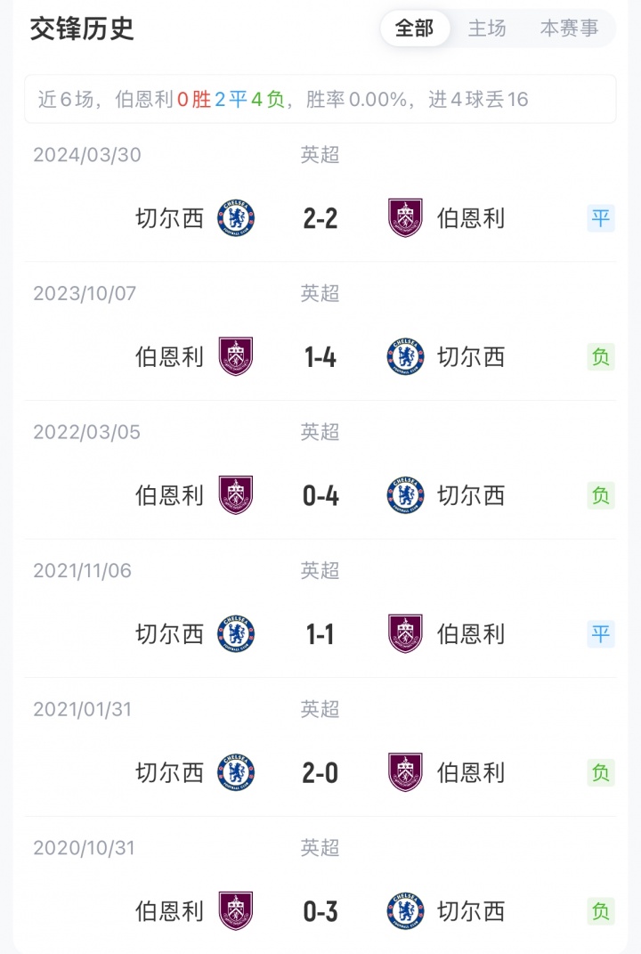 现在,切尔西6胜2平3负积20分位列第3;伯恩利3胜1平7负积10分位列第17。两边近6次交锋,切尔西4胜2平保握不败。