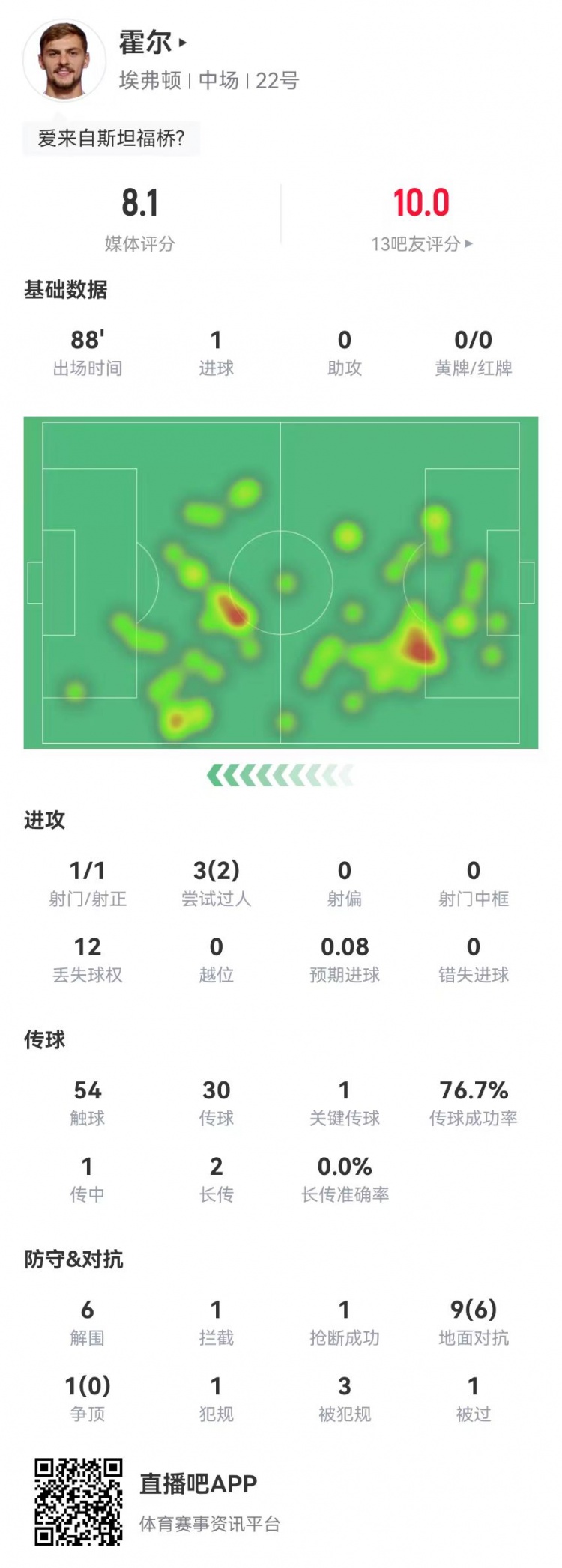 11月25日讯 埃弗顿在本轮英超1-0跳动曼联,霍尔本场数据如下: