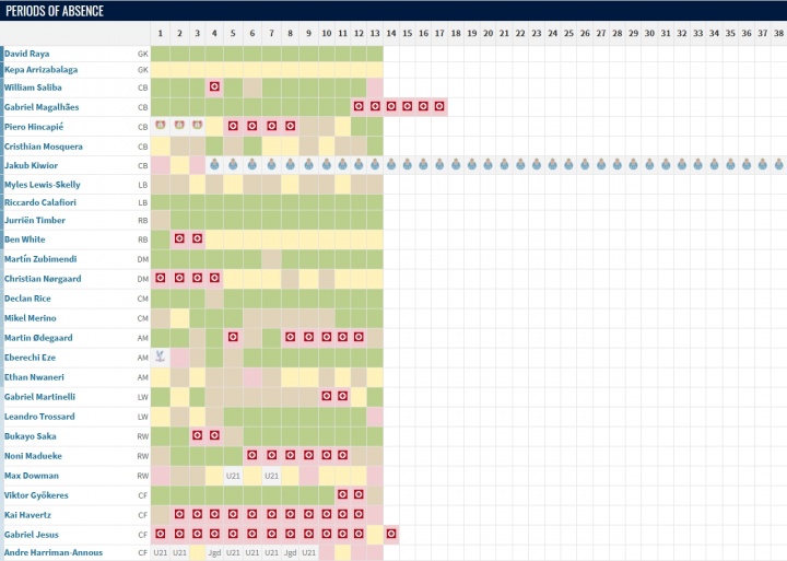 阿森纳球员本赛季联赛出勤情况默示图