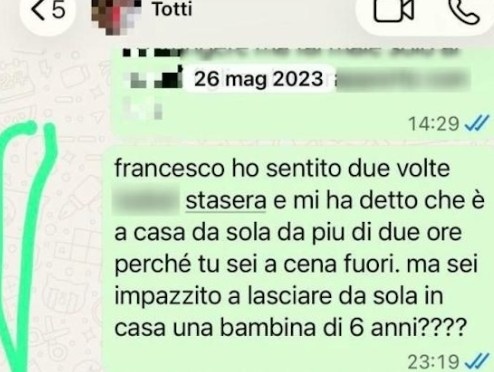 晚上11点19分,她给托蒂发了一条信息:“弗朗切斯科,我今晚两次关系了咱们的男儿,她说你照旧出门就餐跳跃两个小时,把她一个东谈主留在家里。你疯了吗?确实让一个六岁的孩子独清闲家?”之后,布莱西条目她的母亲报警。最终,她决定对前夫过甚新伴侣建议松手未成年东谈主的指控。