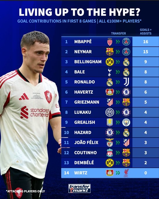 该榜单具体名次如下↓(只统计转会费>1亿欧元的袭击手,数据为进球+助攻)