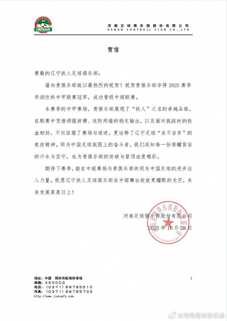 河南俱乐部道喜辽宁铁东说念主夺得2025赛季中甲冠军,胜利晋级中超联赛