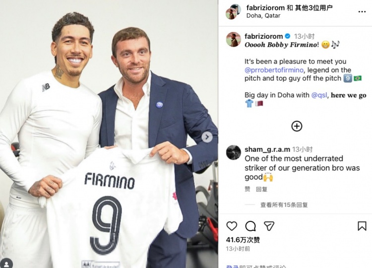 罗马诺写谈:“哦哦哦是菲尔米诺!很适意和你会面,你在场上有着传说般的发扬,不仅如斯,赛场外的你魔力总计。在卡塔尔联赛渡过了充实的一天,Here We Go!”