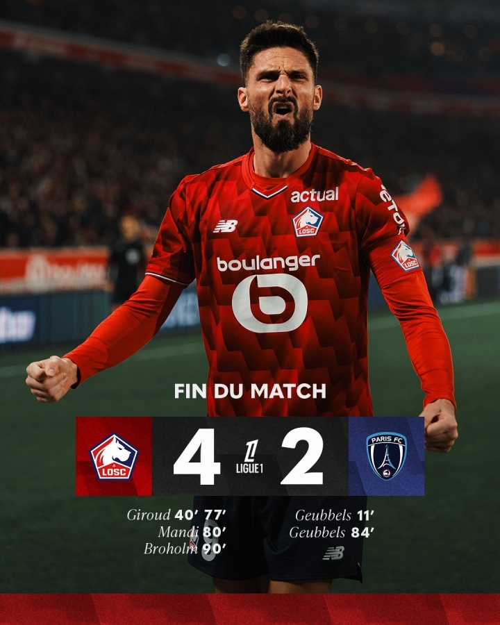 11月24日讯 法甲第13轮,里尔主场4-2逆转巴黎FC,39岁的里尔中锋吉鲁本场比赛梅开二度,拆伙各项赛事9场进球荒。据OPTA统计,吉鲁也成为1947/1948赛季以来,法甲梅开二度年纪最大的球员。