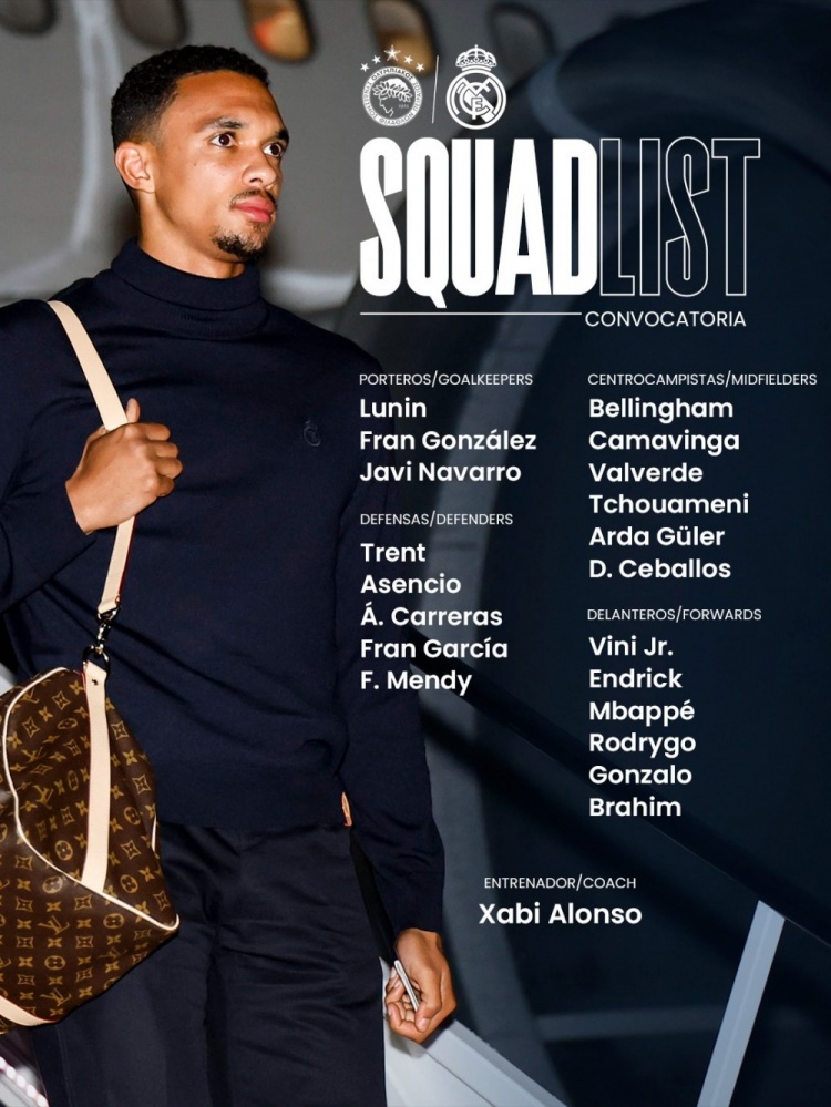 皇马客战奥林匹亚科斯大名单:赫伊森吕迪格缺席,姆巴佩领衔锋线