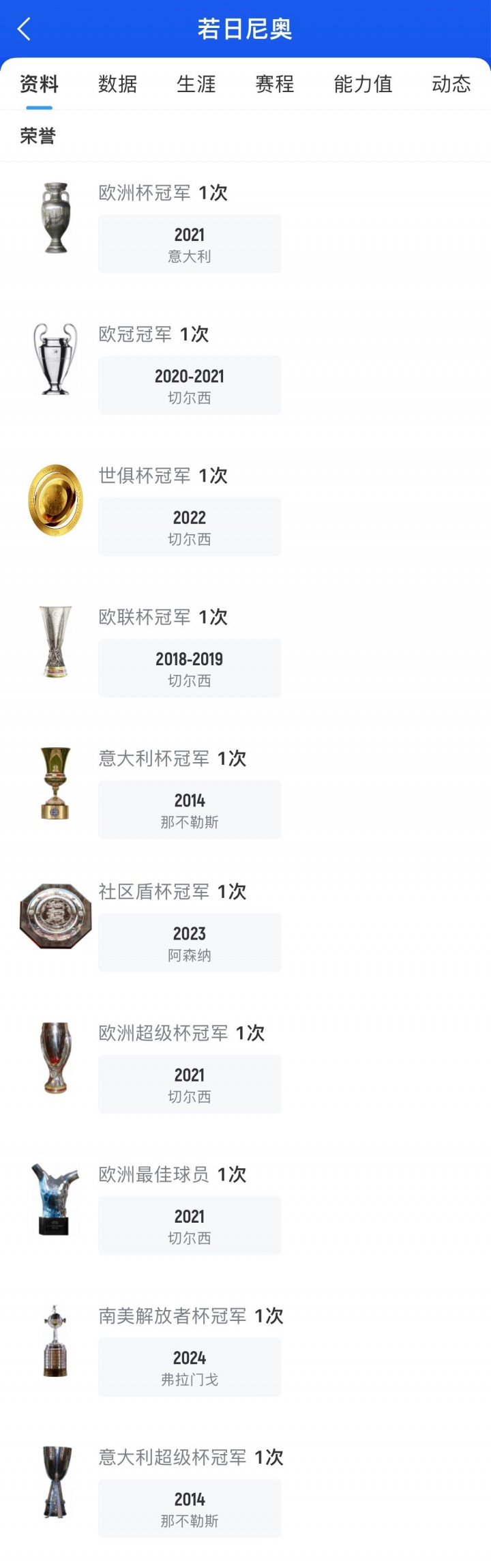 2021年是若日尼奥做事活命巅峰期,他匡助切尔西赢得欧冠冠军,为意大利赢得欧洲杯冠军,在曩昔的金球奖名次中,若日尼奥排在第三位。