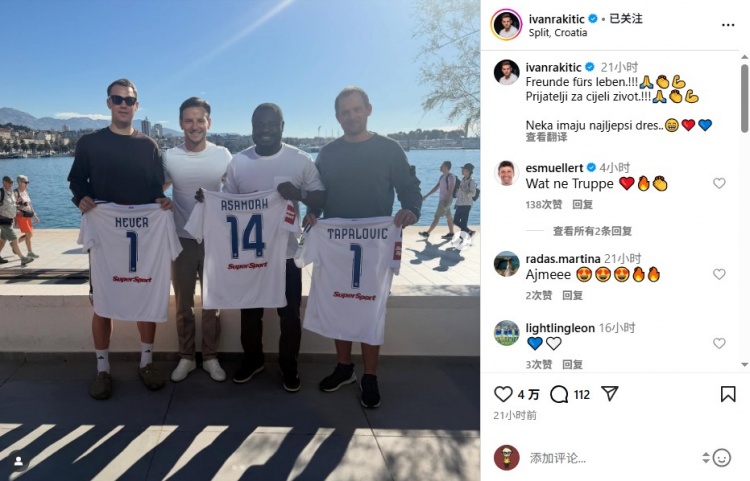 10月11日讯 拉基蒂奇昨晚在Instagram晒照,与阿萨莫阿、诺伊尔、塔帕洛维奇会面。