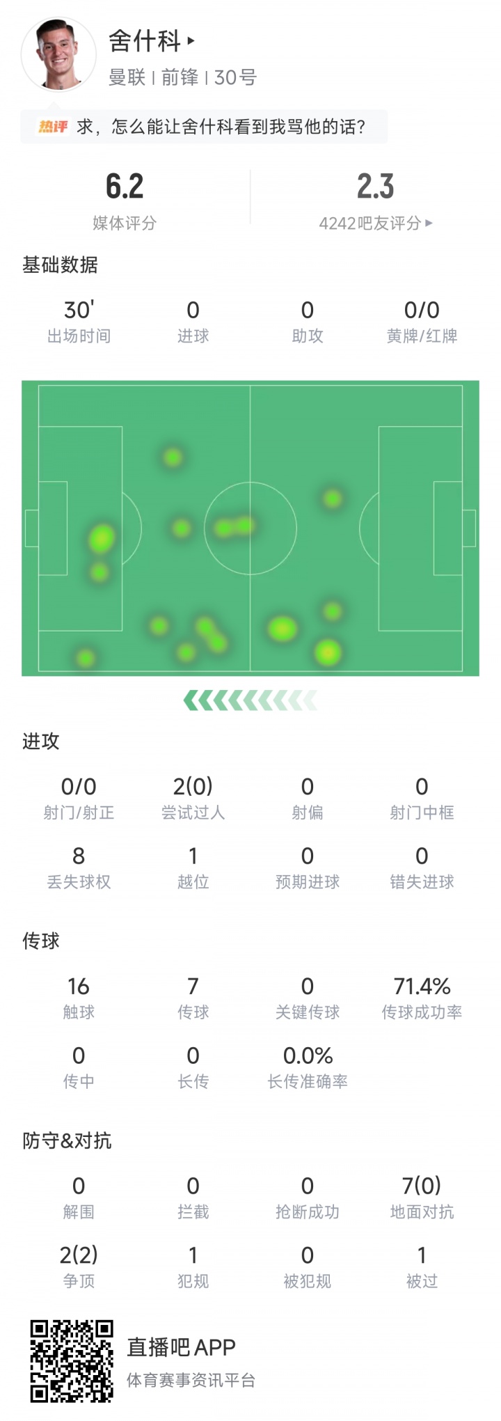 在这半个小时的时辰里,舍什科7次大地顽抗0奏效,16次触球有一半丢了球权。他在第88分钟失单刀时,还因此受伤,甚至曼联不得不10东谈主应战。此外,他本场0射门,过东谈主亦然0奏效。