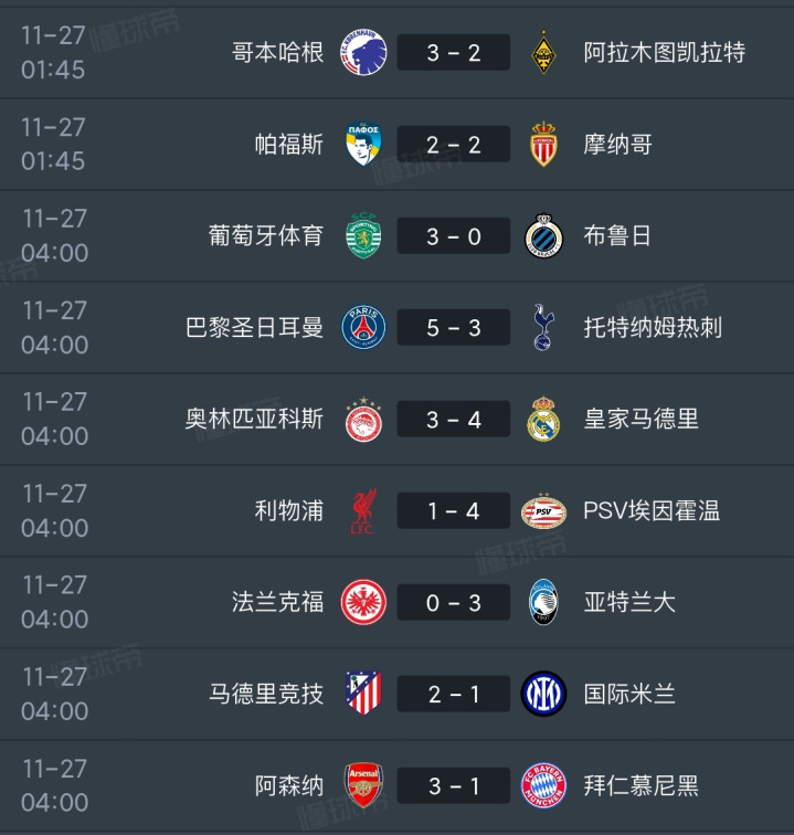 其中哥本哈根3:2阿拉木图凯拉特、帕福斯2:2摩纳哥、阿森纳3:1拜仁慕尼黑、马德里竞技2:1海外米兰,法兰克福0:3亚特兰大,利物浦1:4PSV埃因霍温、奥林匹亚科斯3:4皇家马德里、巴黎圣日耳曼5:3托特纳姆热刺、葡萄牙体育3:0布鲁士。
