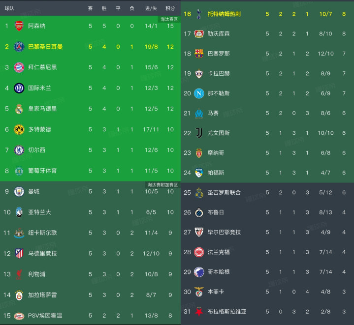 跟着本轮比赛的截至,积分榜也再度出现变化。其中,阿森纳凭借开赛以来的五轮全胜,坐稳第一。巴黎圣日耳曼、拜仁慕尼黑,海外米兰和皇家马德里均是4胜1负,分居2~5名。多特蒙德,切尔西,葡萄牙体育,也位居前八。曼城名依次九、马德里竞技名依次十二、利物浦则位居第十三,巴塞罗那因为开赛以来的2胜1平2负名依次十八。
