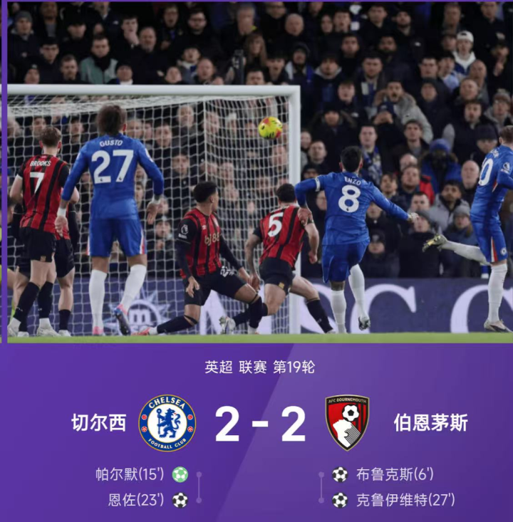 这场平局有点猝不足防,本场前期踢得极度快的节拍,比赛第6分钟布鲁克斯攻破切尔西的大门一球罕见,随后切尔西发动反击得到点球帕尔默主罚射中两队扳平,比赛来到23分钟加纳乔传球恩佐完成破门2:1切尔西罕见,短短曩昔4分钟伯恩茅斯发动反击,克鲁伊维特射中比赛来到2:2再度回到平局,一直到全场比赛规章两队背面60多分钟再无进球。