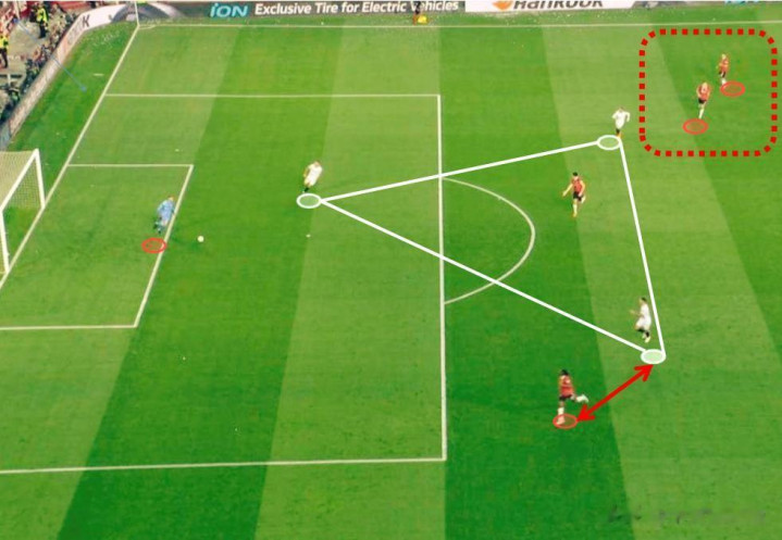 第一个就是逼抢陷阱,所谓的逼抢陷阱曾经是足坛比较热门 的词汇,主要针对后场球员或者出球后腰,那就是放弃对一名接盘带 人的逼抢,迫使对手传送球 给这名球员,然后周围的球员一拥而上围抢,曾经英超球队就经常拿这招对付曼联,上图就是一个典型的案例,后来这一招开始用在守门员上,我前面举了3个例子,其中2个都是守门员接应对手的回传送球 ,自己向前出球时被围抢。