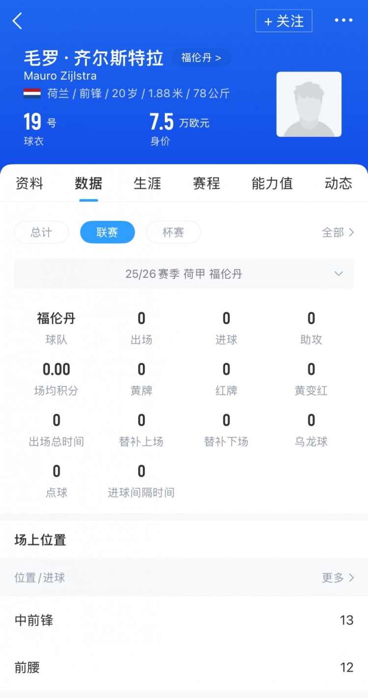 毛罗-都尔斯特拉,出说念于奈梅亨青训,本年1月转会到福伦丹效劳,上赛季在青训队和一线队共出战28场,打进17球助攻7次,随队取得上赛季荷乙冠军,当今德回身价.75万欧。