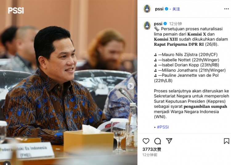 8月26日讯 印尼足协本日官方告示,在近日召开的印尼众议员会议上,5名球员的归化日程已得到会议通过。