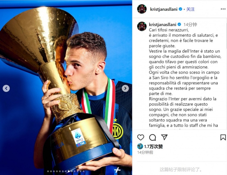 阿斯拉尼社媒告别:感谢通盘搭救我的东说念主,国米将遥远在我心中