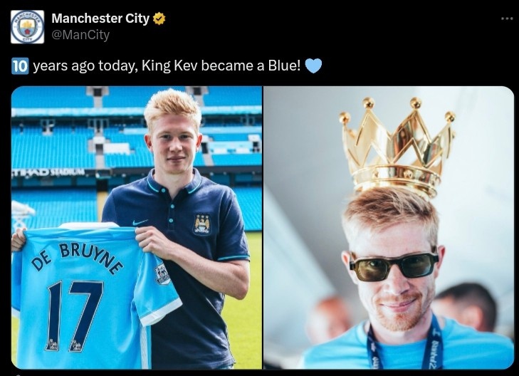 外传开动,曼城官推晒照:10年前今天,国王德布劳内成为球队一员