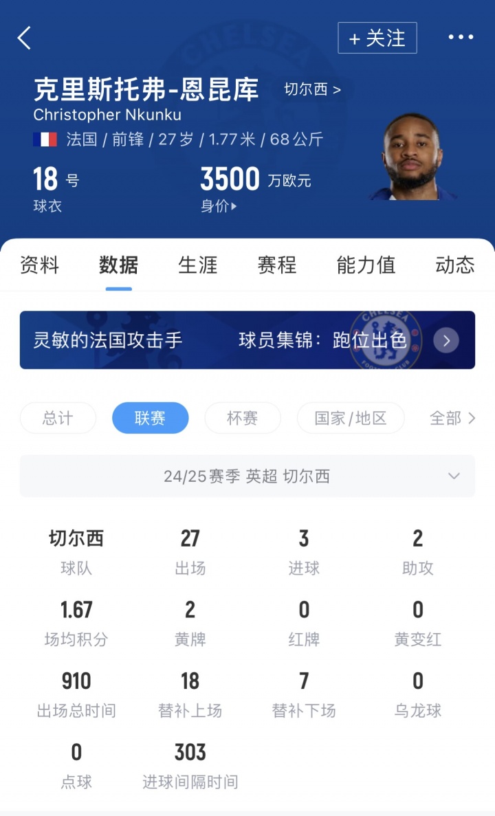 恩昆库现年27岁,与切尔西现存公约在2029年到期,现德转估值为3500万欧。恩昆库2023年夏窗6000万欧从莱比锡加盟切尔西,当今已出场62次,打入18球并有5次助攻。