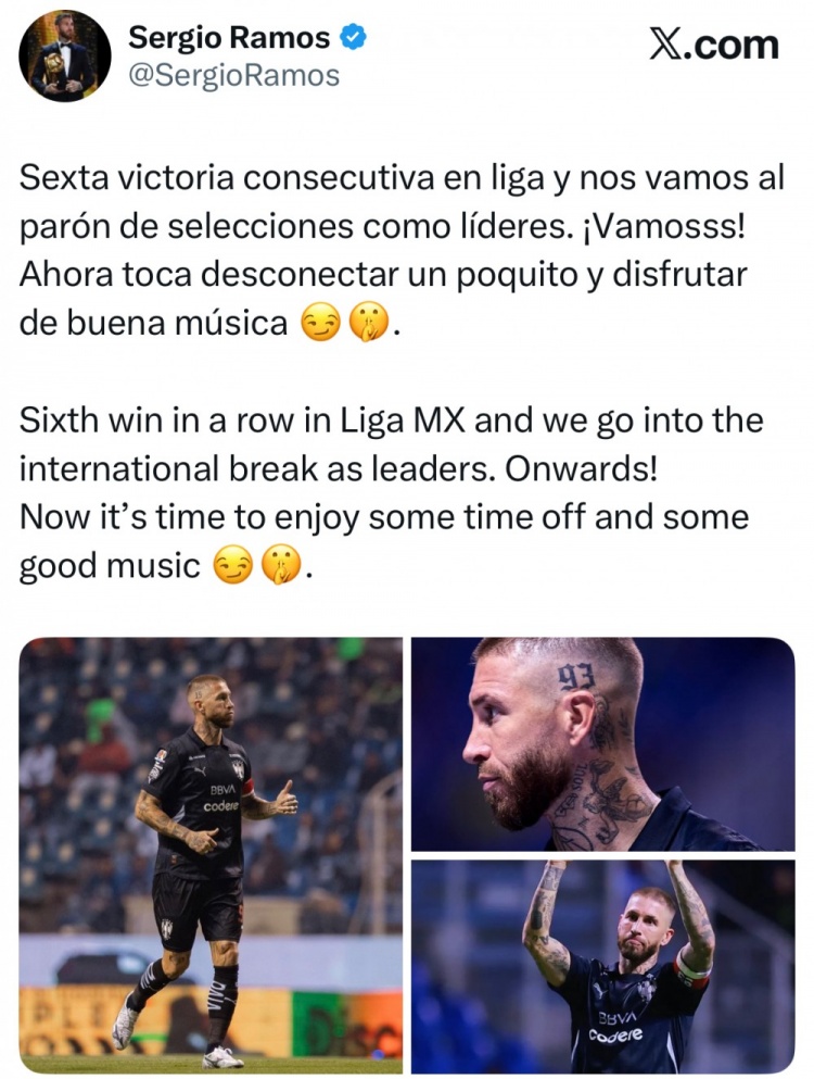 助蒙特雷联赛6连胜&榜首,拉莫斯社媒:是时辰减弱减弱,听听音乐