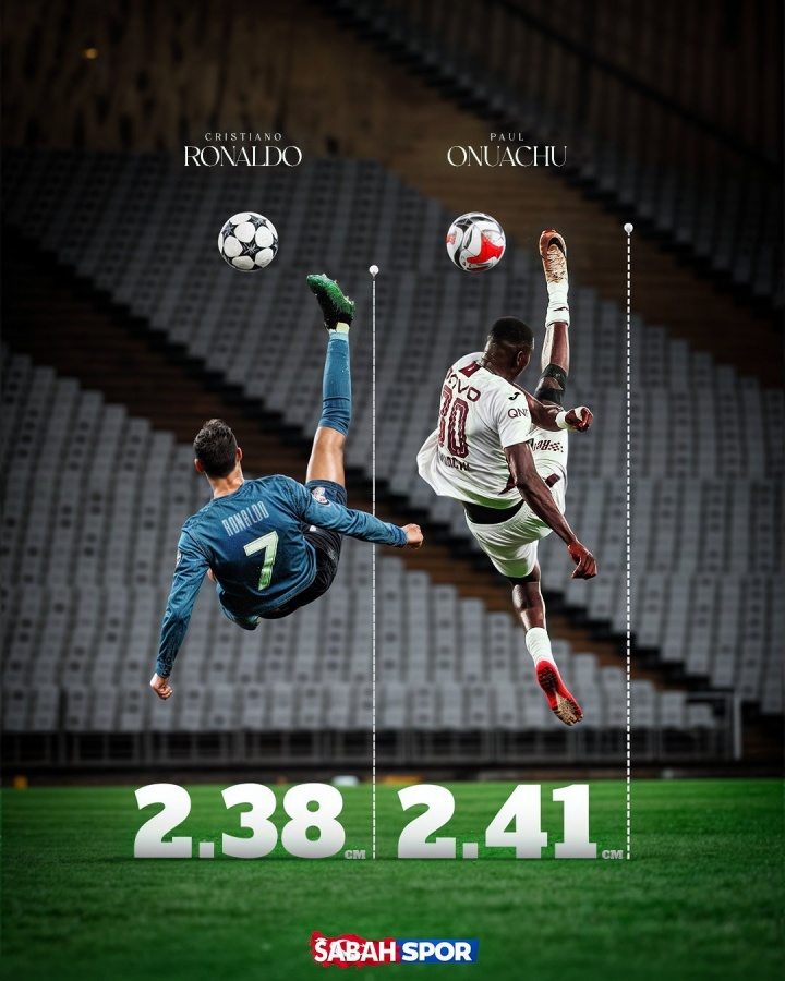 身高2.01米的奥努阿楚,日前打进一粒精彩的倒钩进球,触球点高度达2.41米。已往C罗的天秀倒钩触球点高度为2.38米。