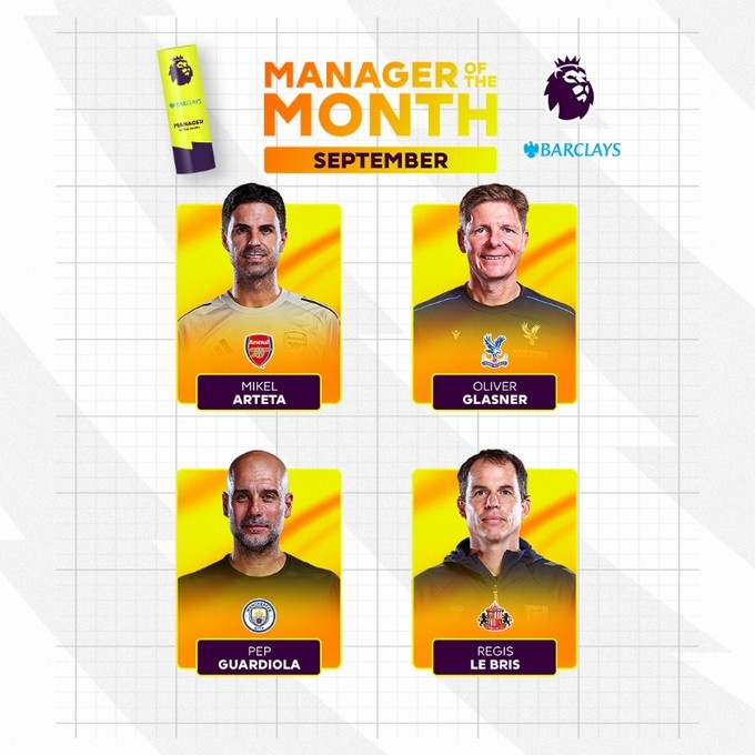 10月2日讯 英超公布9月份最好磨真金不怕火候选名单,阿尔特塔、格拉斯纳、瓜迪奥拉和勒-布里斯入围。