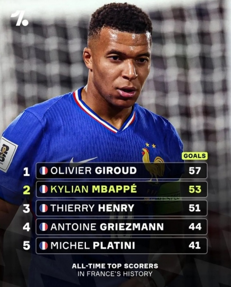 最初,姆巴佩有可能高出吉鲁,成为法国国度队的历史最好弓手。当今,姆巴佩照旧攻入53球,吉鲁则有57球。对阵阿塞拜疆的比赛中姆巴佩再次进球,看起来他很可能在明夏宇宙杯之前就竣事这一宗旨。