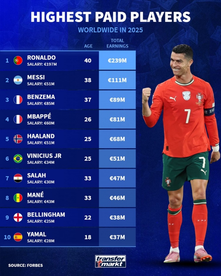 2025年球员收入排行:C罗2.39亿欧居首,梅西1.11亿欧次席