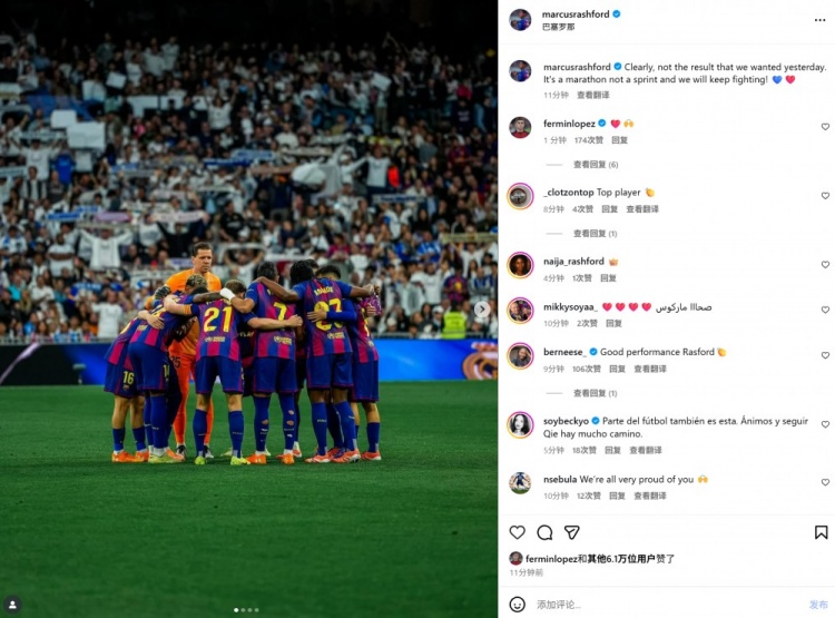 本场比赛拉什福德首发出场送出助攻,赛后他也在社媒晒出全队合照,配文写说念:“昭彰昨天的比赛成果不是咱们念念要的,但联赛是一场马拉松而不是短跑,咱们会不时拼搏!”