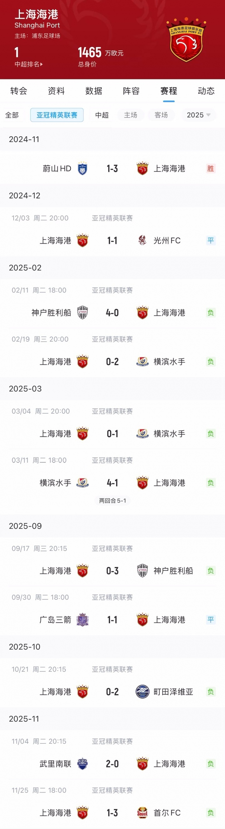 11月25日讯 亚冠精英联赛东亚区第5轮,上海海港主场1-3不敌首尔FC,亚冠跨赛季已勾搭10场未曾胜绩。