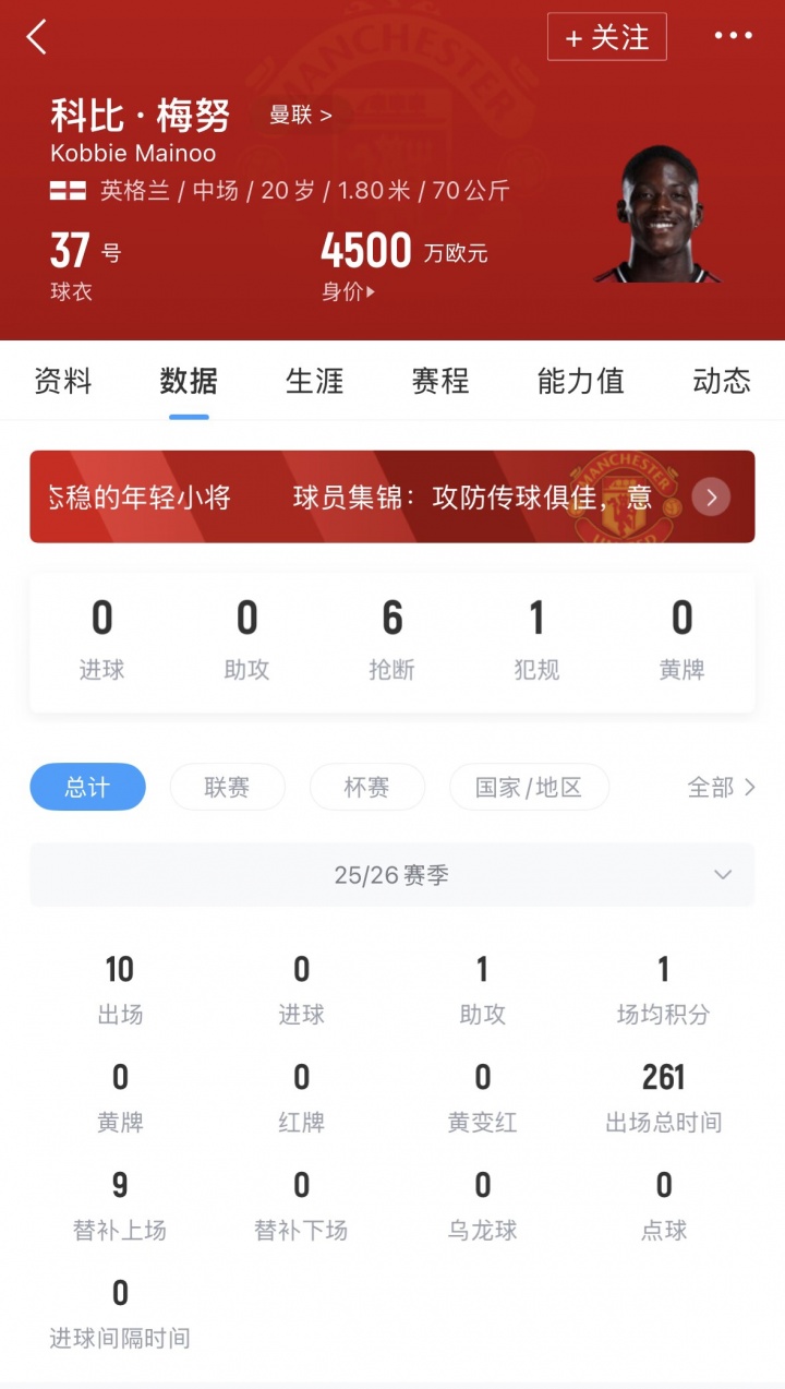 梅努本赛季代表曼联出战10场孝顺1次助攻,当今身价4500万欧